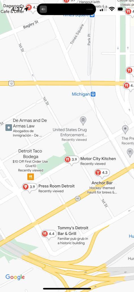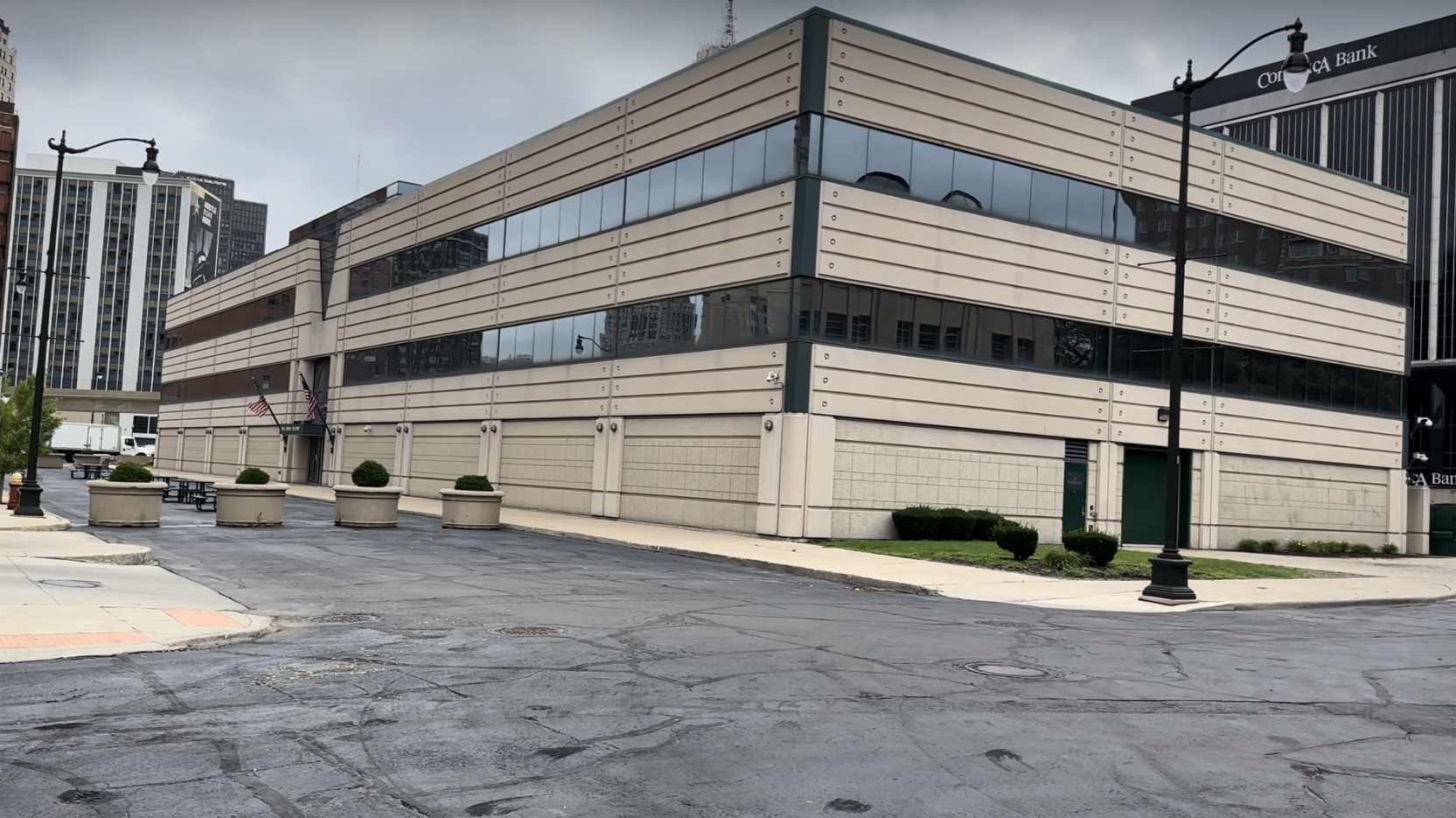 Here’s what the building looks like (below). You can see that it’s close to Comerica Bank (in the right upper corner of the picture) across Lafayette. This picture was taken from First Street and Howard looking southeast.